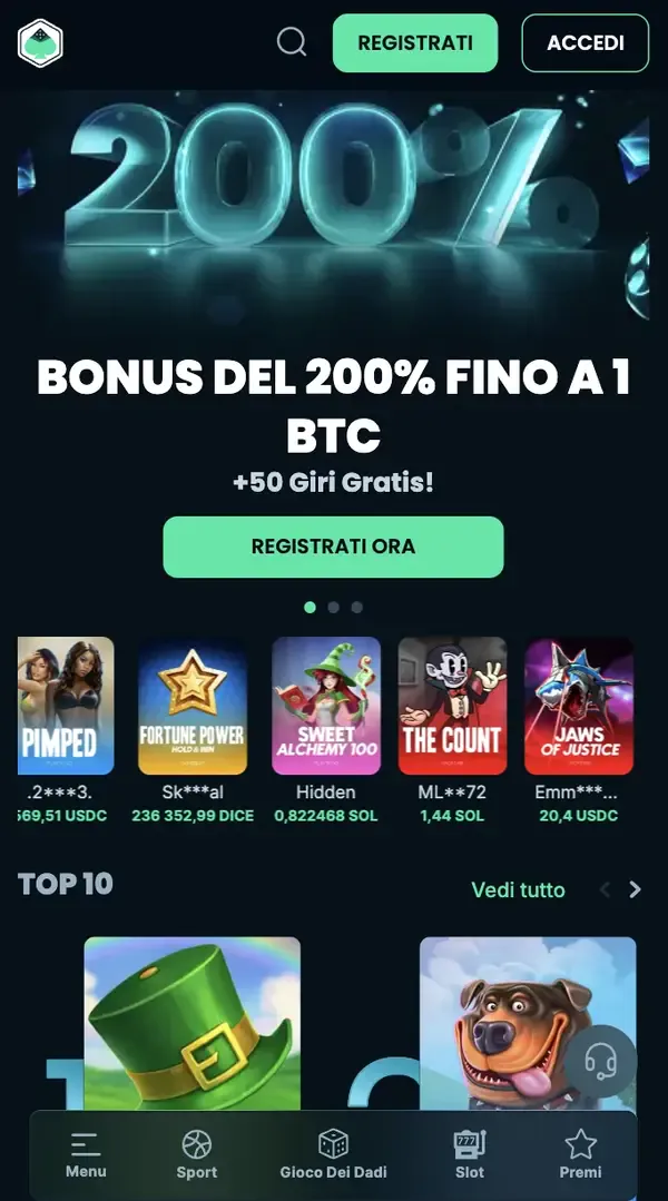 Per le offerte, il benvenuto per l’Italia include 200% fino a 1 BTC (equivalente a circa €60.000), più 50 giri gratis su Wanted Dead or a Wild, con deposito minimo di €20 e rilascio a scaglioni del 10% dopo ogni 6x di wagering del deposito iniziale (60x totali). Questo significa che il bonus MegaDice può essere usato anche su telefono, purché tu rispetti gli stessi requisiti del desktop. Se vuoi più valore dopo, Monday Reload e Wednesday Game of the Week sono disponibili dalla stessa area promo.
